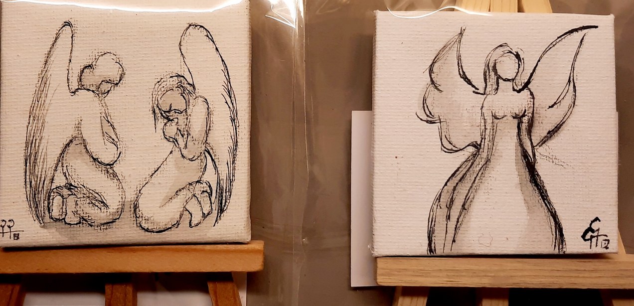 Ze vlogen uit van mini engeltjes van 7×7 (rechts) vanuit Galerie Dronten tot wandvullend van 60×180 vanuit het atelier ![]() |
