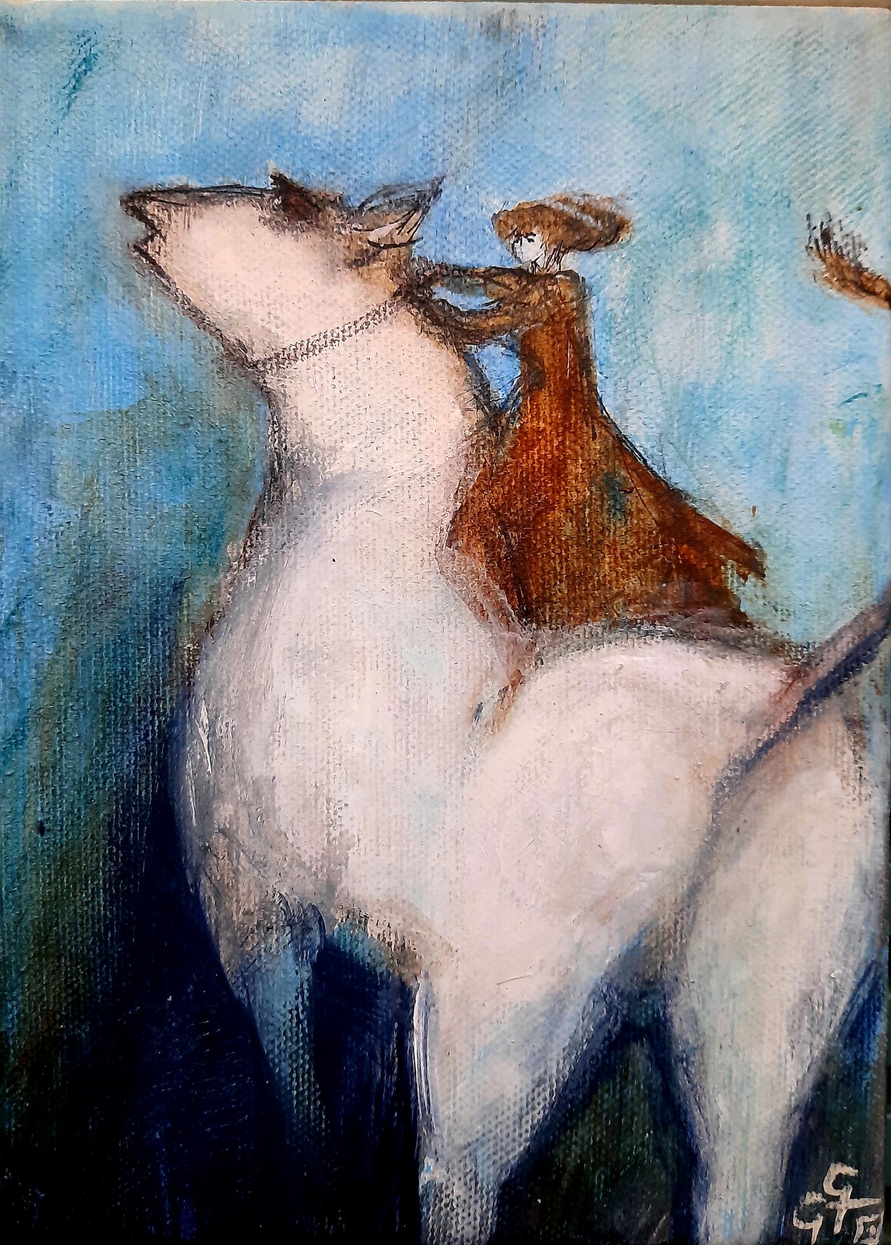 Roepende(n), 50×65, acryl op paneel. De laatste kraanvogel vloog naar Almere. Zin om een nieuwe vlucht te schilderen…