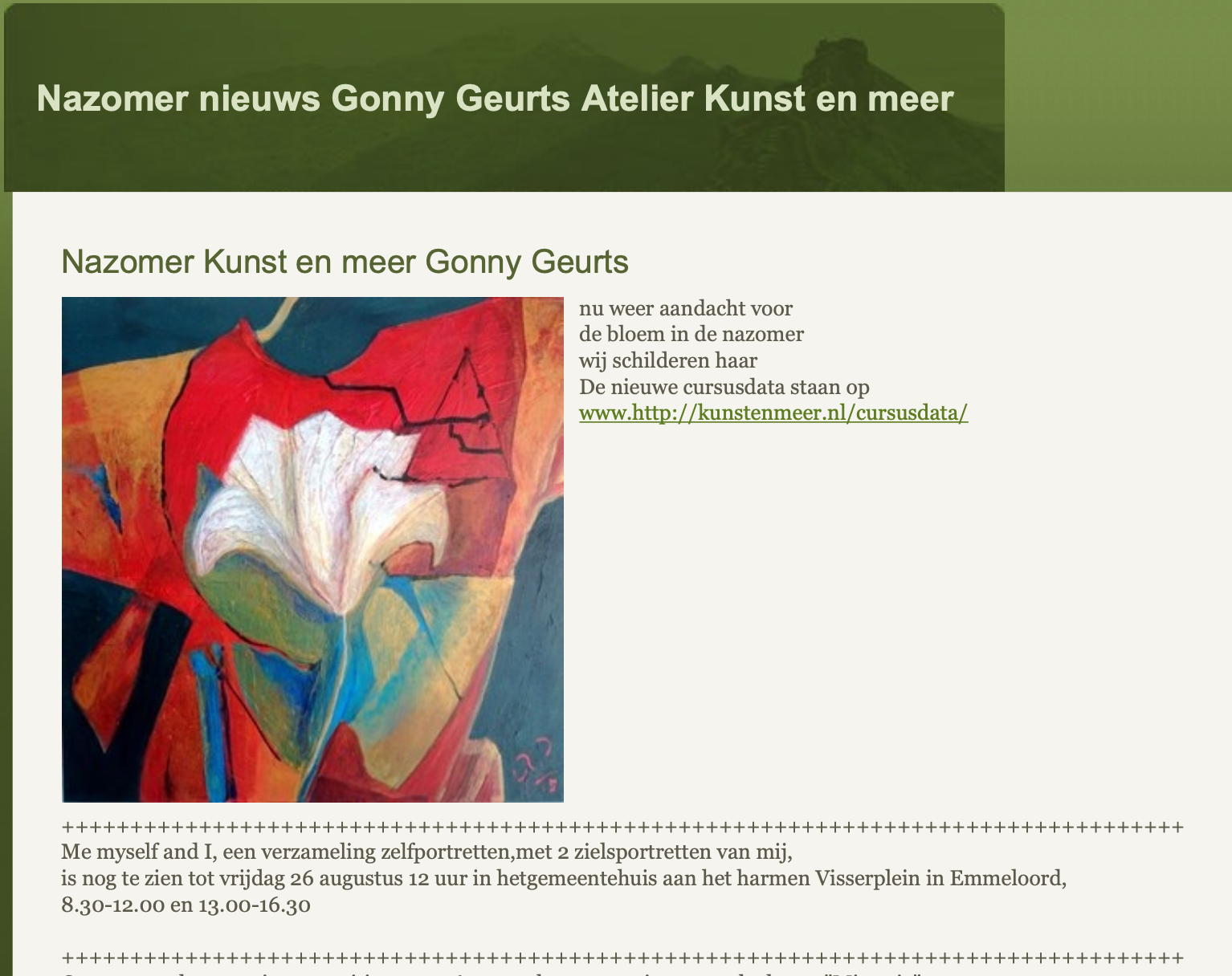 4. Als ik het werk van Gonny bekijk moet ik aan mijn schip denken die vroeger over de Zuiderzee voer en later door de polder. De kleuren herinneren mij niet alleen aan de tijd die ik in mijn jeugd in de polder heb doorgebracht …maar ook later mijn leven met mijn gezin op dit schip… het is prachtig beeld!