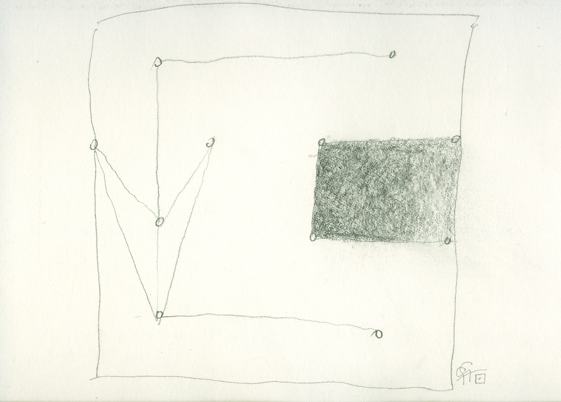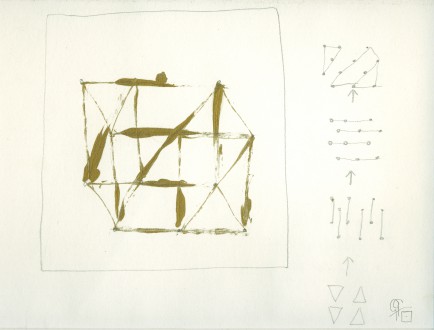 Een dubbel patroon van 4 tot 8 stippen, steeds op een ander manier met elkaar verbonden door een simpel lijntje.Door reeksen van deze patronen te maken op kleine papierrolletjes ontstonden lange rijen variaties, waarvan het einde nooit in zicht leek te komen.